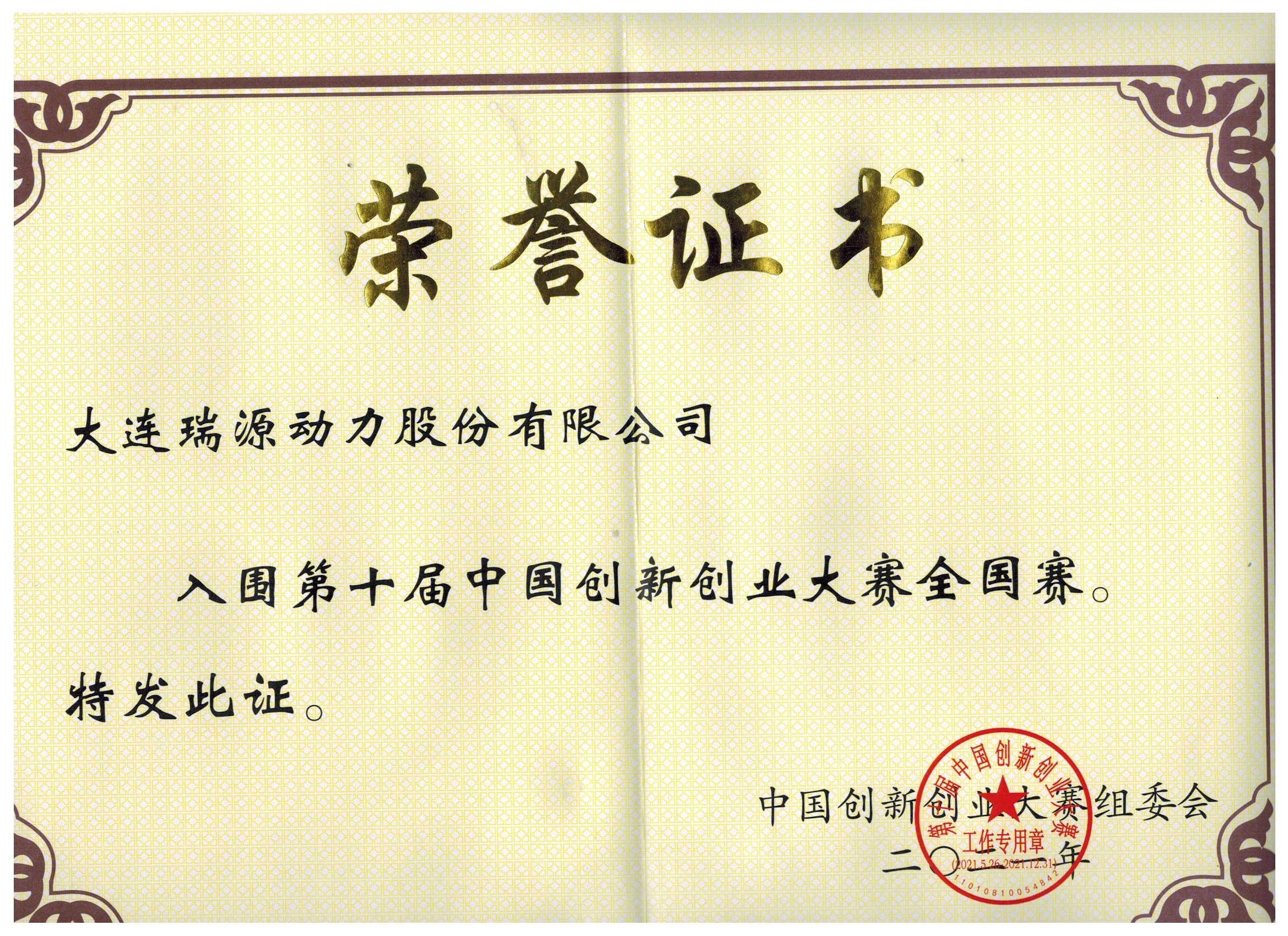 在2021年九月十四日 大连瑞源动力股份有限公司参与大连市第十届创业创新大赛一路披荆斩棘 夺得二等奖并入围国赛!